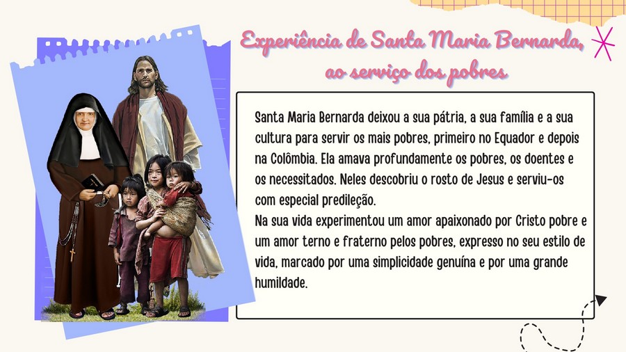 Santa Maria Bernarda deixou a sua pátria, a sua família e a sua cultura para servir os mais pobres, primeiro no Equador e depois na Colômbia. Ele amava profundamente os pobres, os doentes e os necessitados. Neles descobriu o rosto de Jesus e serviu-os com especial predileção.