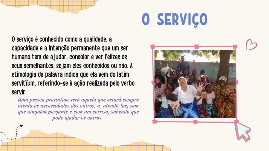 O serviço é conhecido como a qualidade, capacidade e intenção permanente que um ser humano tem de ajudar, consolar e ver felizes os seus semelhantes, sejam eles conhecidos ou não. A etimologia da palavra indica que ela vem do latim servitium, referindo-se à ação realizada pelo verbo servir.