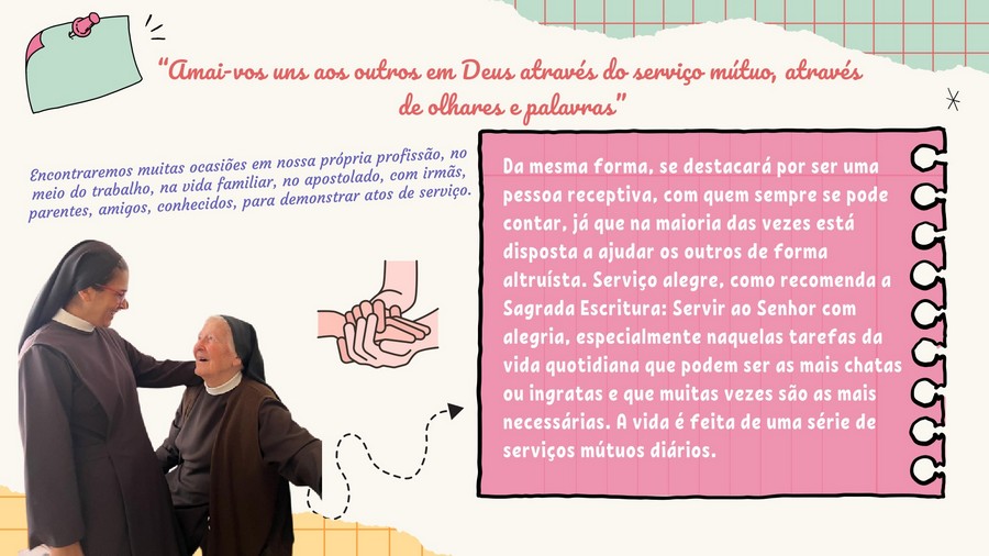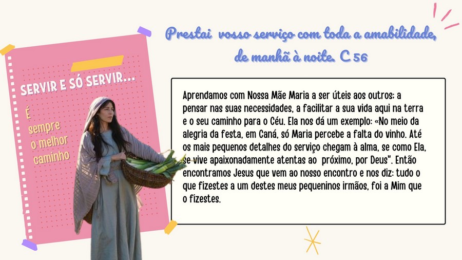Aprendamos com Nossa Mãe Maria a ser úteis aos outros; a pensar nas suas necessidades, a facilitar a sua vida aqui na terra e o seu caminho para o Céu. Ela nos dá um exemplo: «No meio da alegria da festa, em Caná, só Maria percebe a falta do vinho… Até os mais pequenos detalhes do serviço chegam à alma, se como Ela, se vive apaixonadamente atento aos próprios próximo, por Deus”. Depois encontramos muito facilmente Jesus, que vem ao nosso encontro e nos diz: tudo o que fizestes a um destes meus pequeninos irmãos, foi a Mim que o fizestes.
