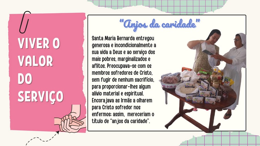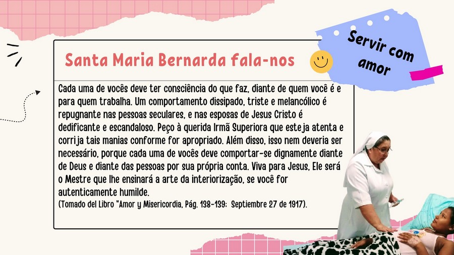 Diante do sofrimento e da miséria do povo, Madre Bernarda questionou, contemplou e rezou, assim: “Aceita, Senhor, as necessidades, a miséria, a fome, a sede, o frio e as dores do corpo e da alma de milhares de pobres, e ajuda-nos, com a tua graça, a servi-los generosamente.”